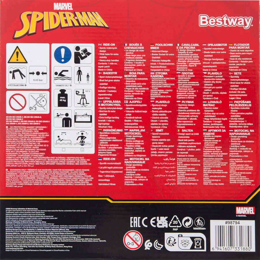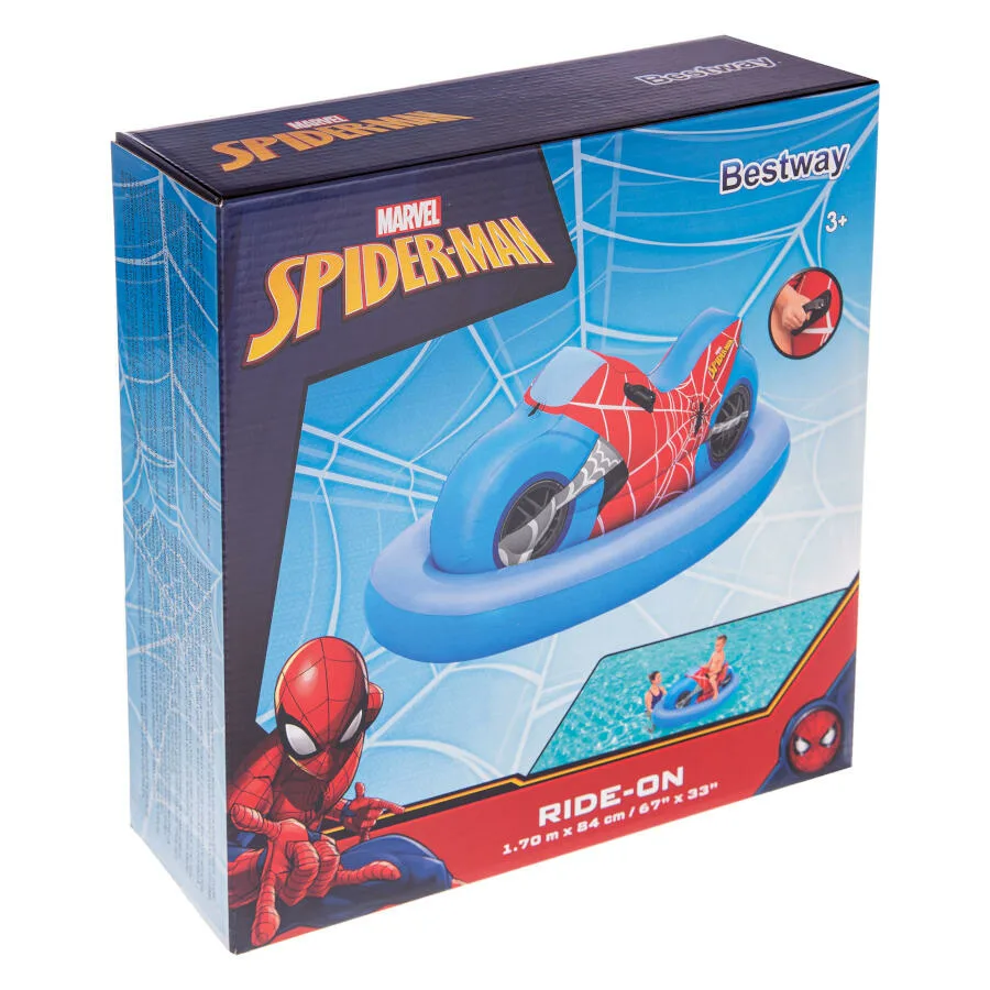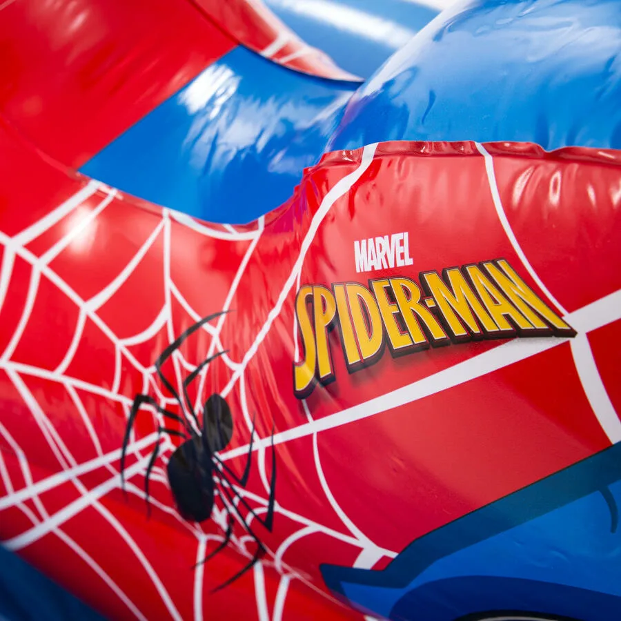 Marca: Bestway. Licencia oficial Marvel Spiderman. Material: vinilo resistente de alta calidad. Edad recomendada: de 5 a 7 años. Incluye parche de reparación para pequeños imprevistos. Se infla rápidamente con bomba de aire manual o eléctrica. Ligera y fácil de transportar una vez desinflada. SKU: 121421. EAN: 6941607331880.