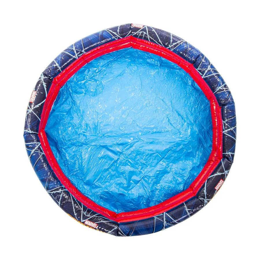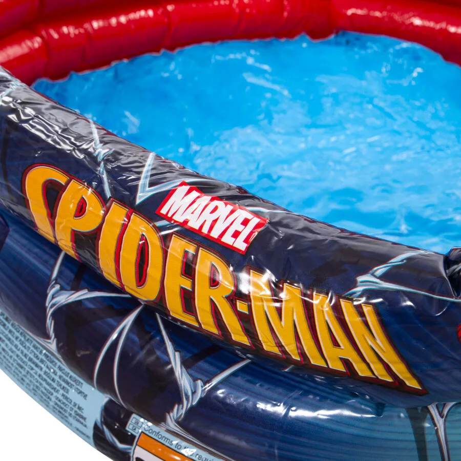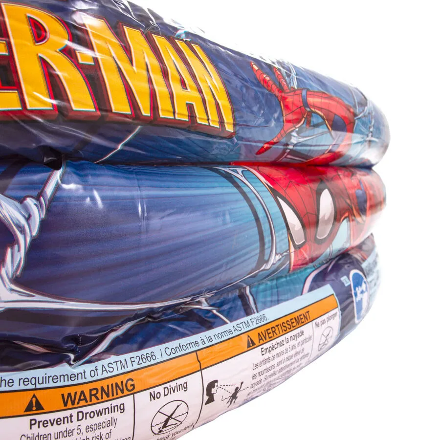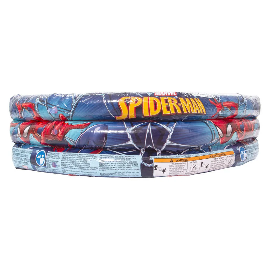 Diseño oficial Marvel Spiderman con gráficos a todo color. Estructura de 3 anillos independientes para mayor estabilidad y seguridad. Material: vinilo resistente al cloro y a la radiación UV. Inflado rápido con bomba manual o eléctrica. Tamaño compacto ideal para jardines, terrazas, patios y balcones amplios. Fácil vaciado y almacenamiento al final de la temporada. SKU: 203059. EAN: 6942138903874.