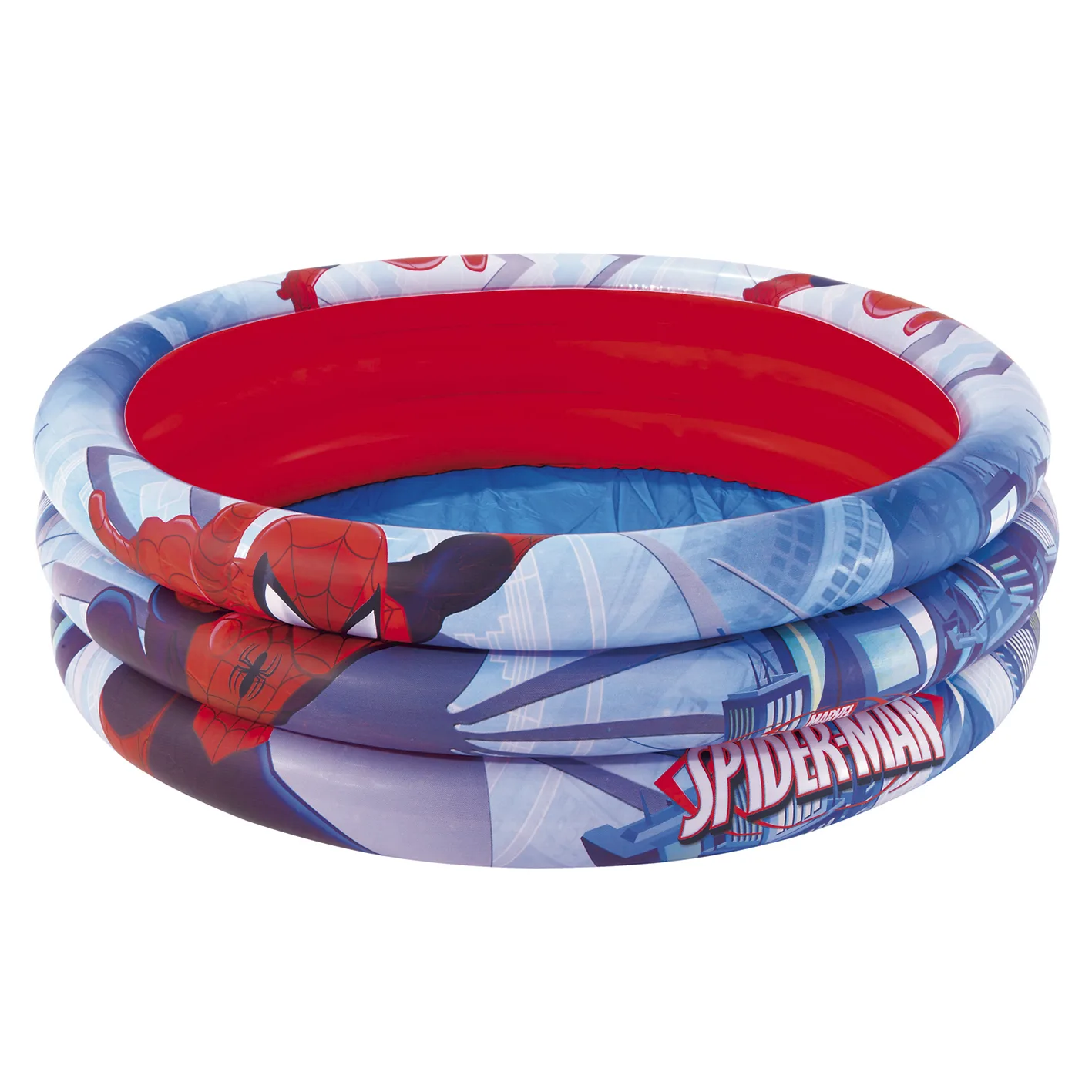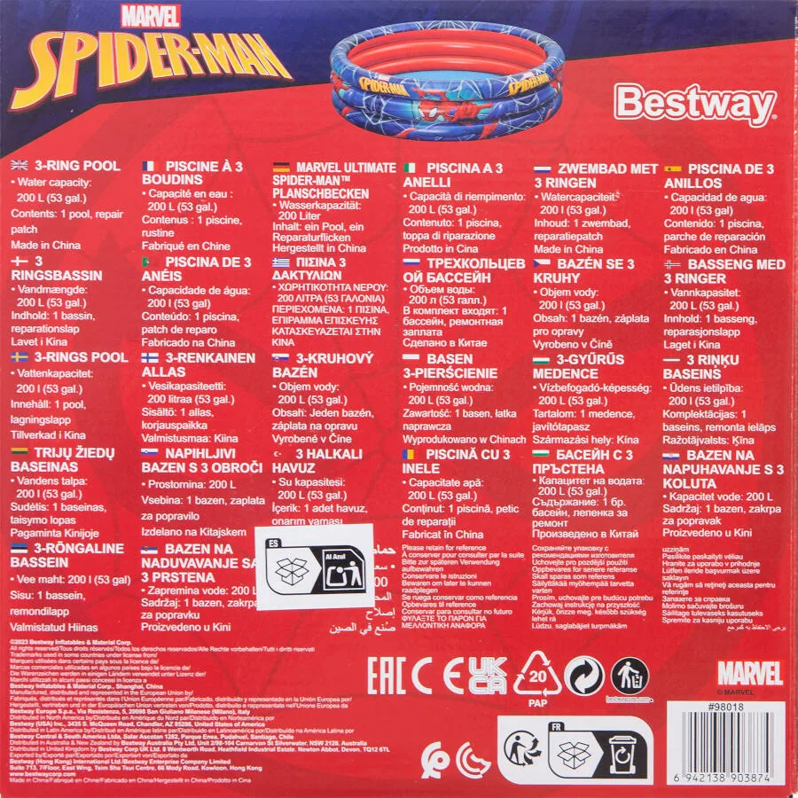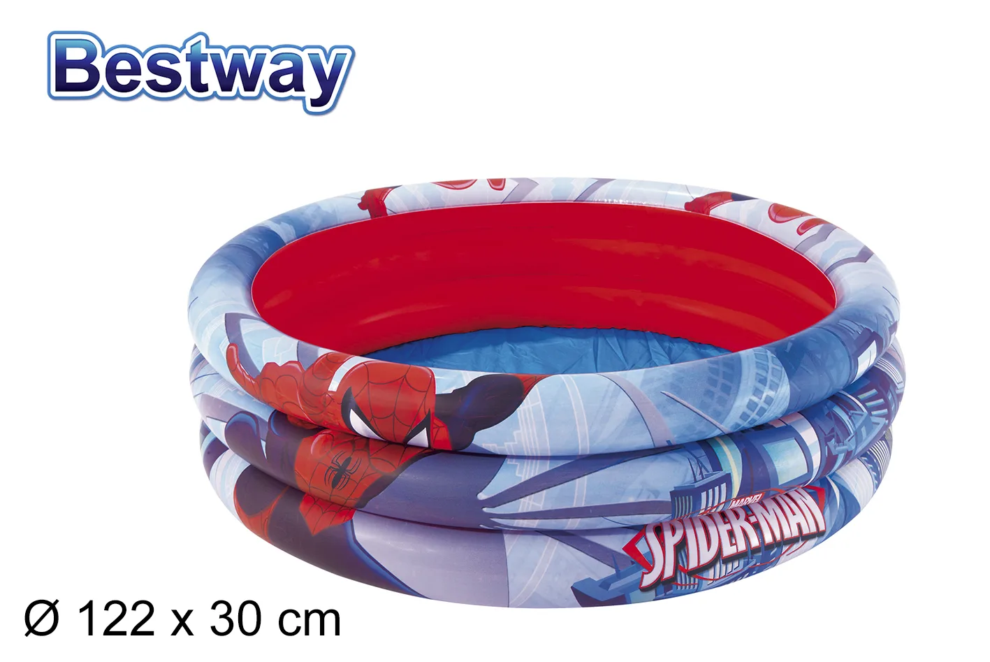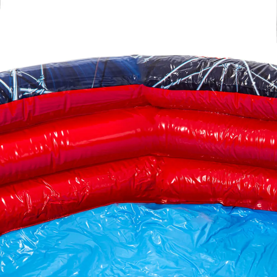 Diseño oficial Marvel Spiderman con gráficos a todo color. Estructura de 3 anillos independientes para mayor estabilidad y seguridad. Material: vinilo resistente al cloro y a la radiación UV. Inflado rápido con bomba manual o eléctrica. Tamaño compacto ideal para jardines, terrazas, patios y balcones amplios. Fácil vaciado y almacenamiento al final de la temporada. SKU: 203059. EAN: 6942138903874.